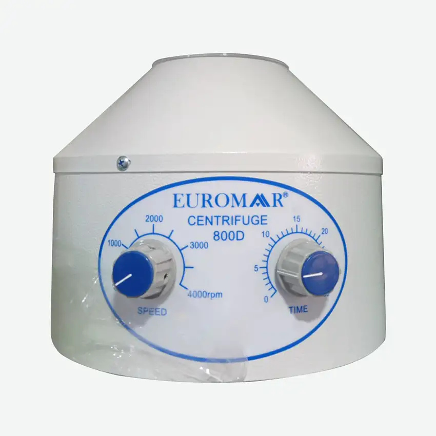 Centrífuga de laboratorio Euromar 800D con control de velocidad y tiempo, ideal para una separación rápida y segura de muestras clínicas.