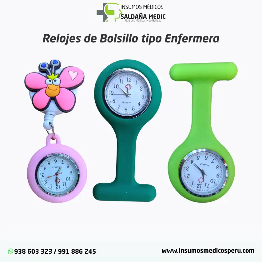 Los relojes de bolsillo tipo enfermera están diseñados para brindar practicidad, higiene y comodidad durante la jornada clínica. Se sujetan fácilmente al uniforme, evitando el uso en la muñeca y facilitando la lectura rápida de la hora sin interferir con los protocolos sanitarios.